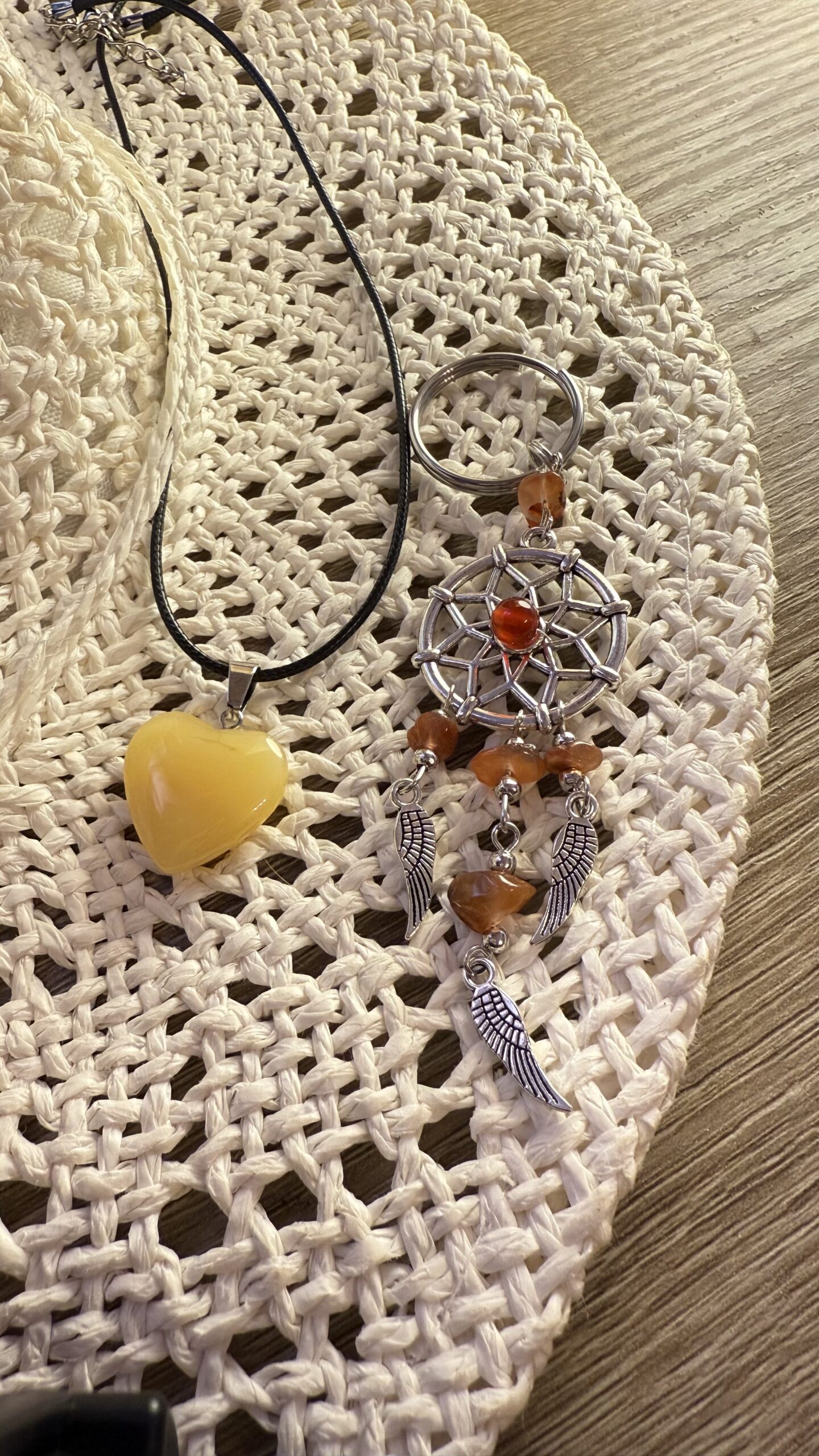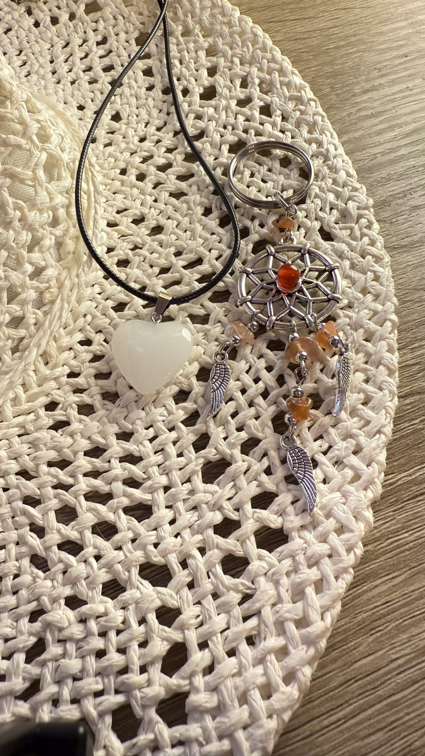 🌙 Komplekti kuulub unenäopüüdja kujuline võtmehoidja ja kristallripatsiga kaelakee.